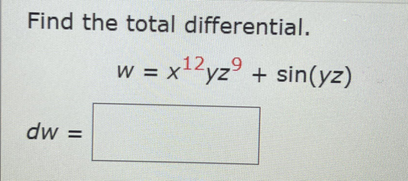 Solved Find the total differential.w=x12yz9+sin(yz)dw= | Chegg.com