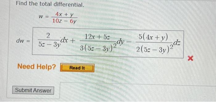 Solved Find the total differential. w=5z−10y8x+y | Chegg.com