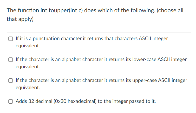 Solved The function int toupper(int c) does which of the | Chegg.com