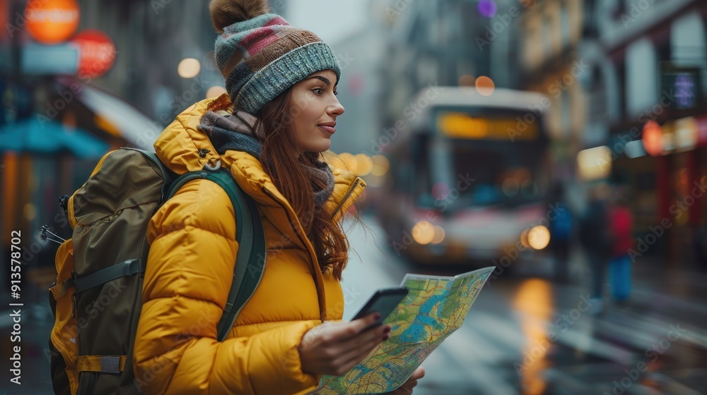 A european travel guide for a female tourist using a map while ...