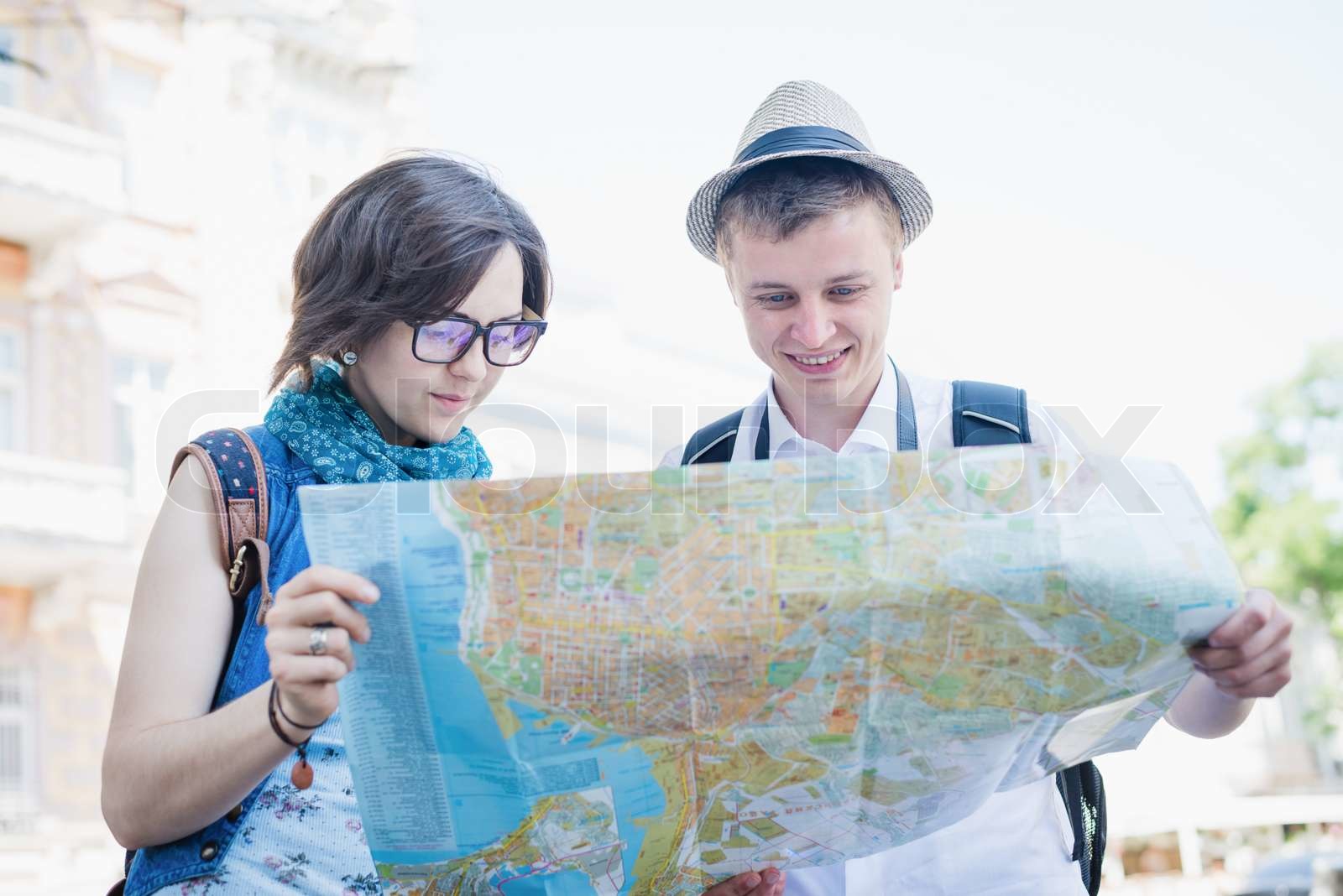 Young happy tourists holding map sightseeing in city Stock Photo - Alamy