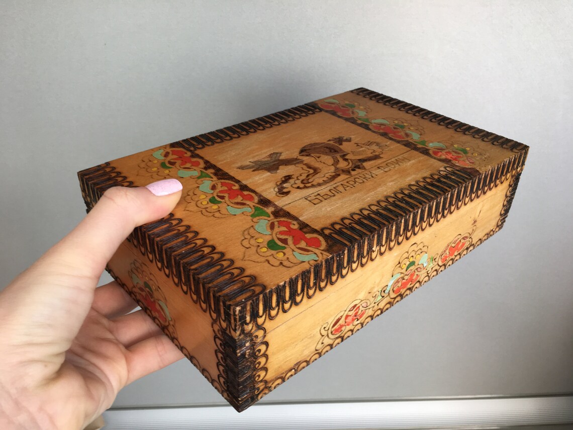 Vintage Wooden Pyrography Box, Bulgarian Wooden Trinket box, Hand ...