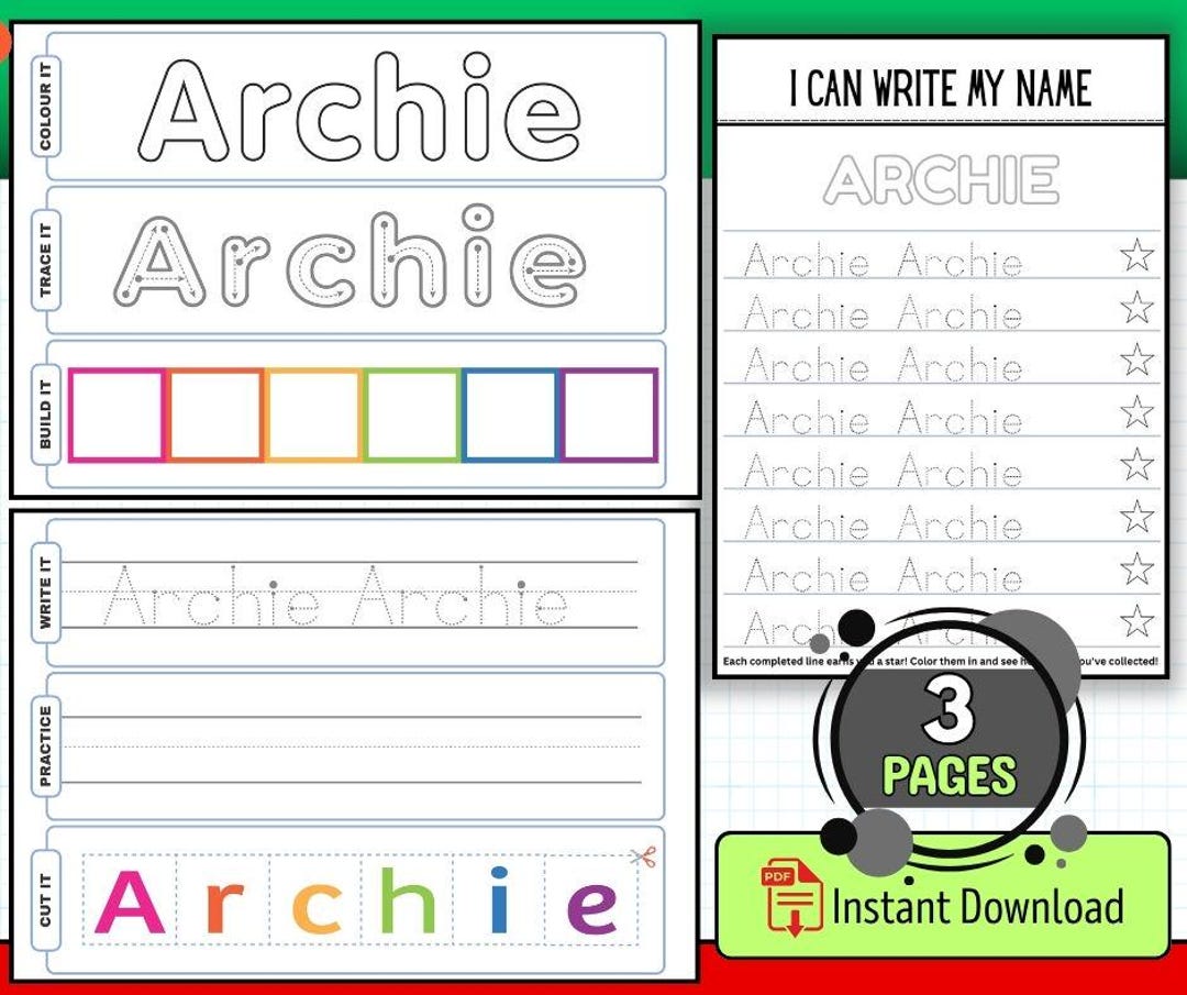 Archie Name Tracing Worksheet – Preschool Writing Practice | Printable ...