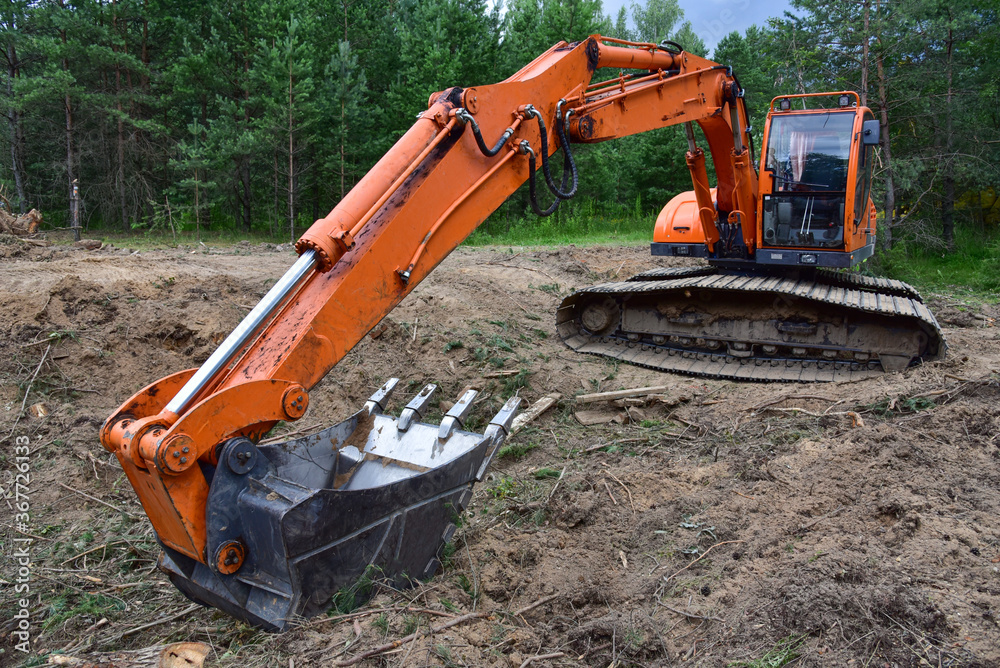 Excavator clearing forest for new development. Orange Backhoe modified ...