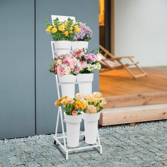 3-Tier White Flower Display Stand with 6 Round Buckets, Ladder Design ...