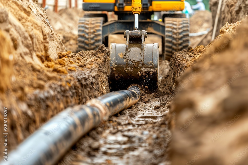 Tractor excavator digs a hole for installing a collector line and pipes ...