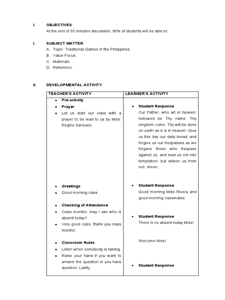 Traditional Games Lesson Plan | PDF | Lord's Prayer | Cognition