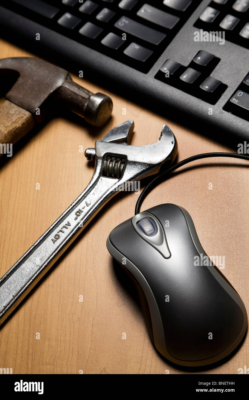 Computer mouse, old tools placed next to compute keyboard Stock Photo ...