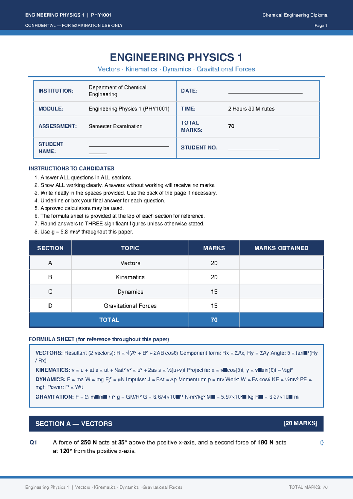 Engineering Physics 1 (PHY1001) Semester Exam: Vectors, Kinematics ...