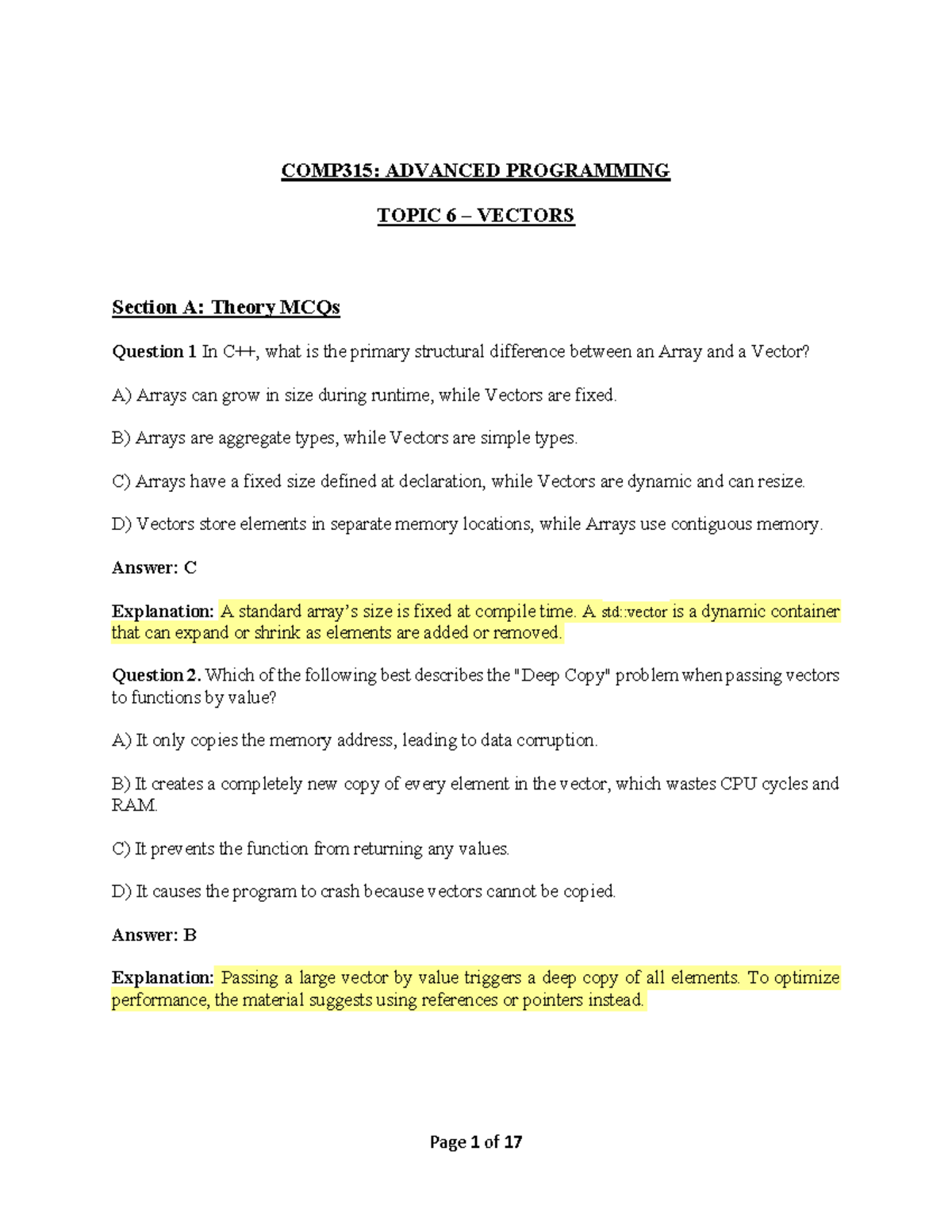 COMP315: Advanced Programming Topic 6 - Vectors MCQs and Explanations ...