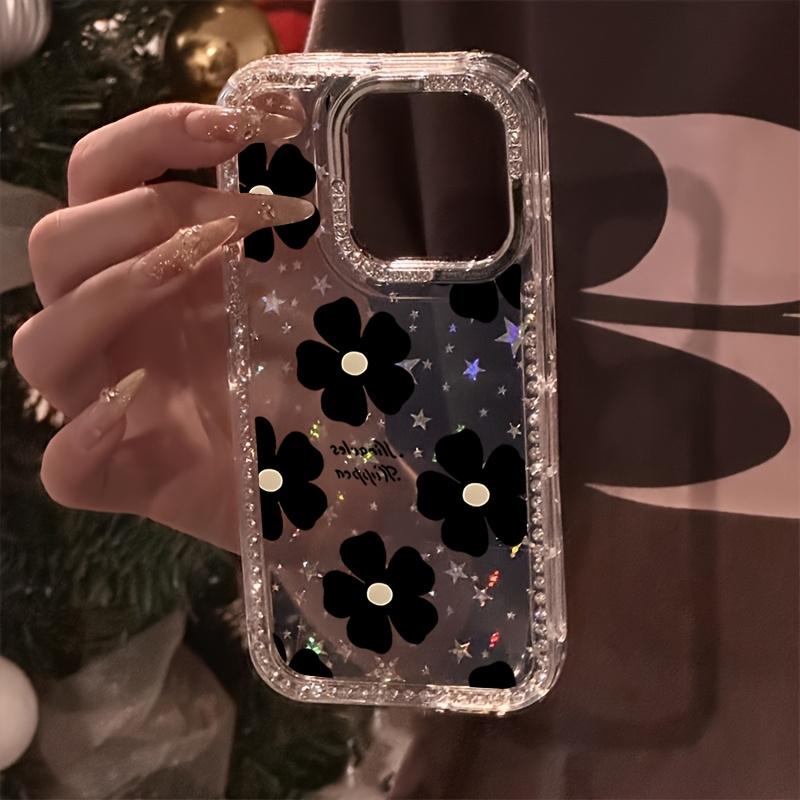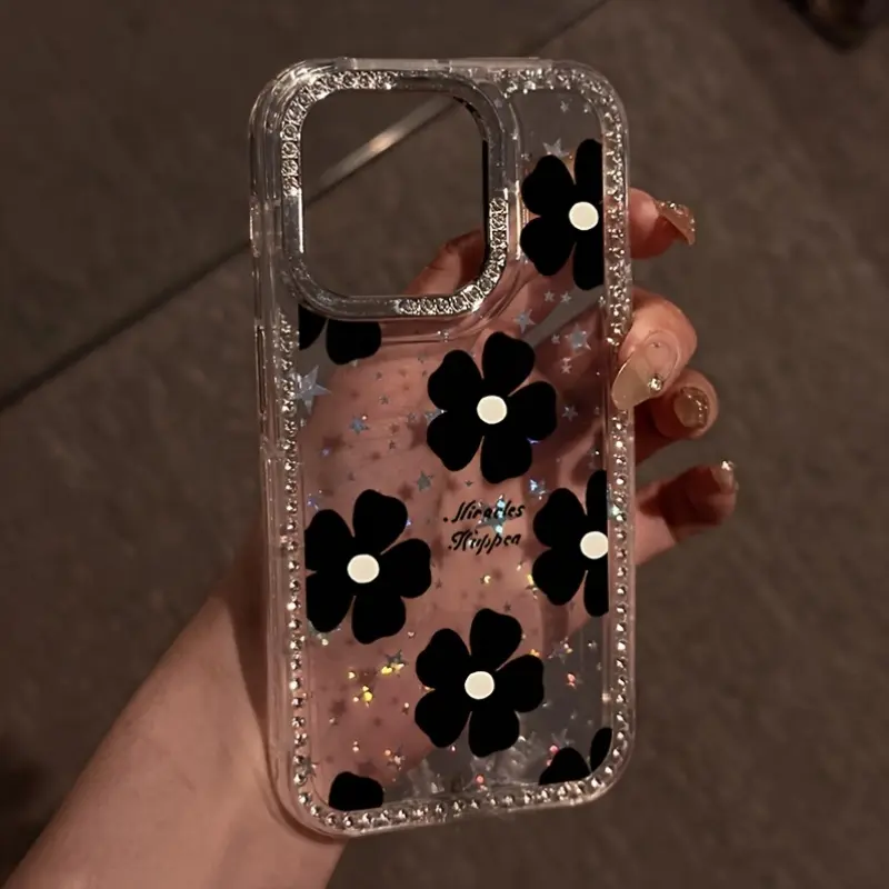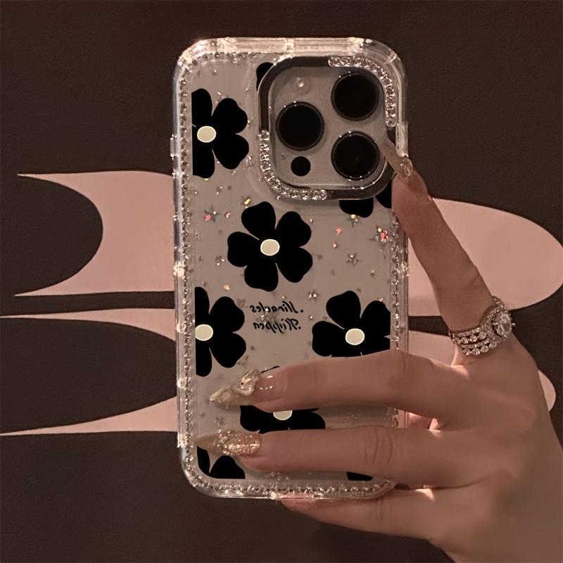Black floral pattern luxury rhinestone fashion phone case, transparent ...