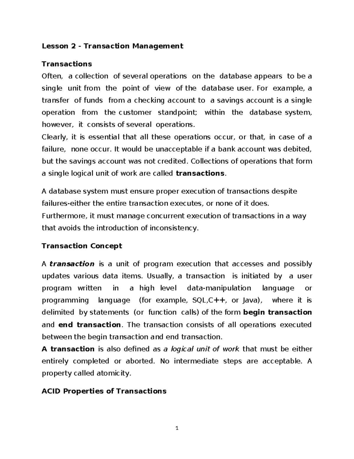Lesson 2 - Understanding Transaction Management in Databases - Studocu