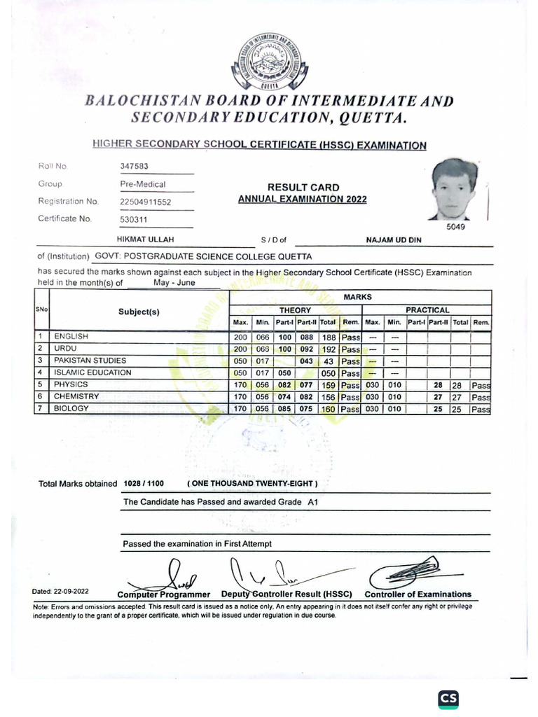 Provisional Marks Certificate BISE Mardan | PDF | Educational Stages ...