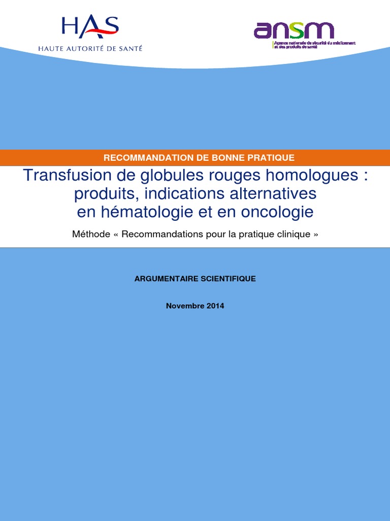 Transfusion de globules rouges homologues : produits, indications ...