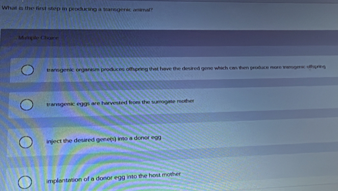 Solved: What is the first step in producing a transgenic animal ...