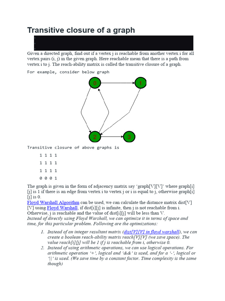 Transitive Closure of A Graph: For Example, Consider Below Graph | PDF ...