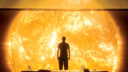 Translucent globe appearing at horizon, expanding and rotating over ...
