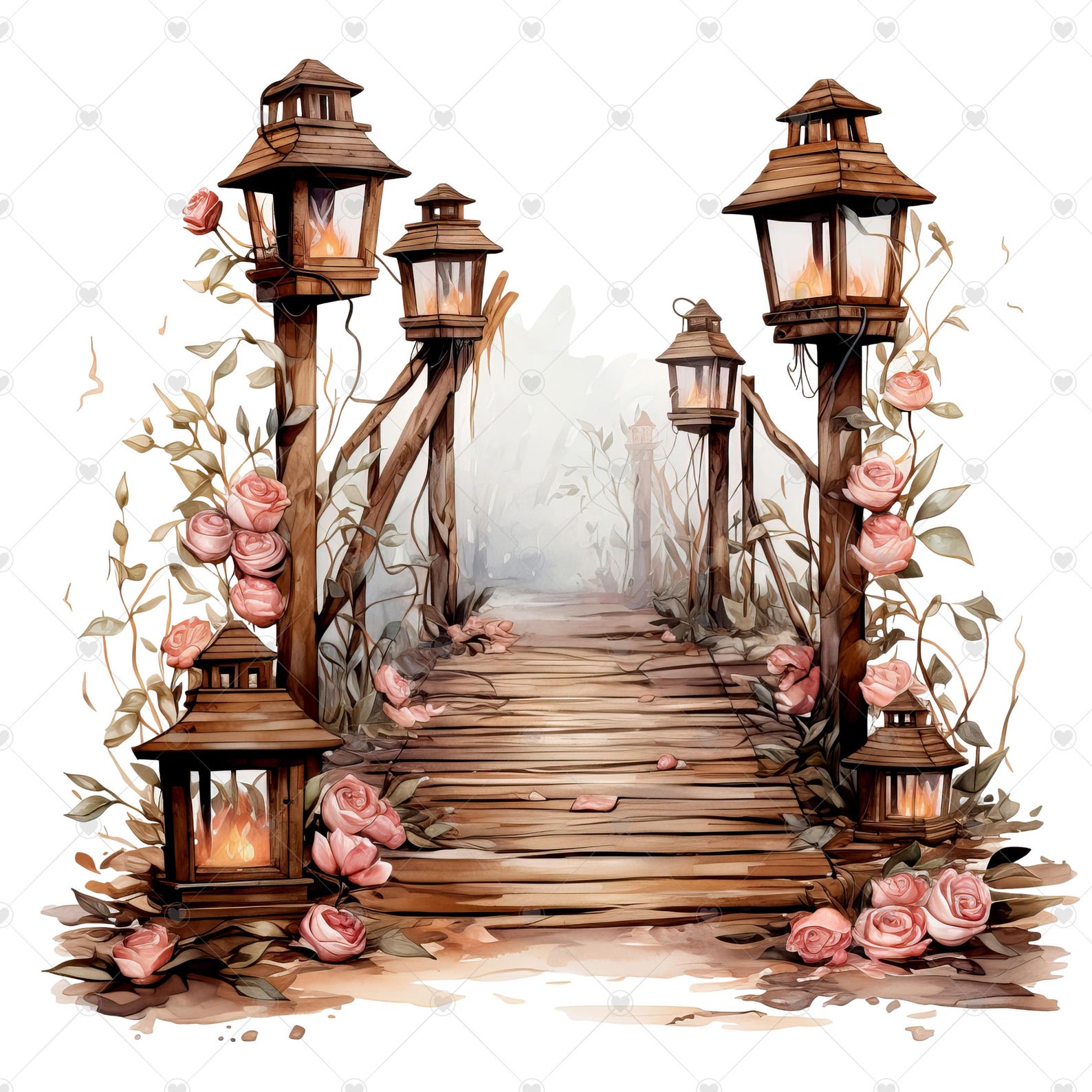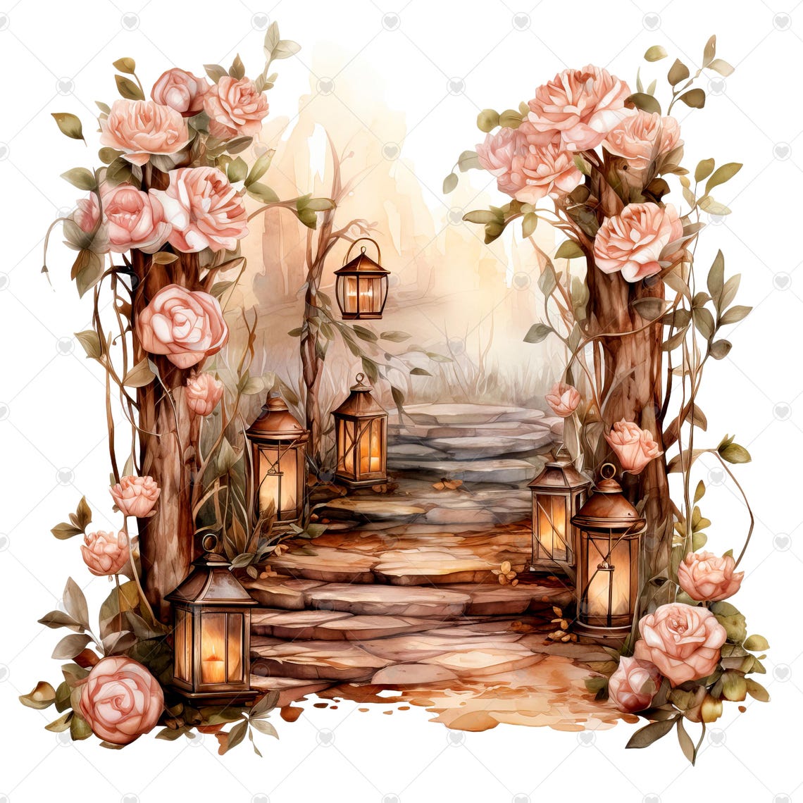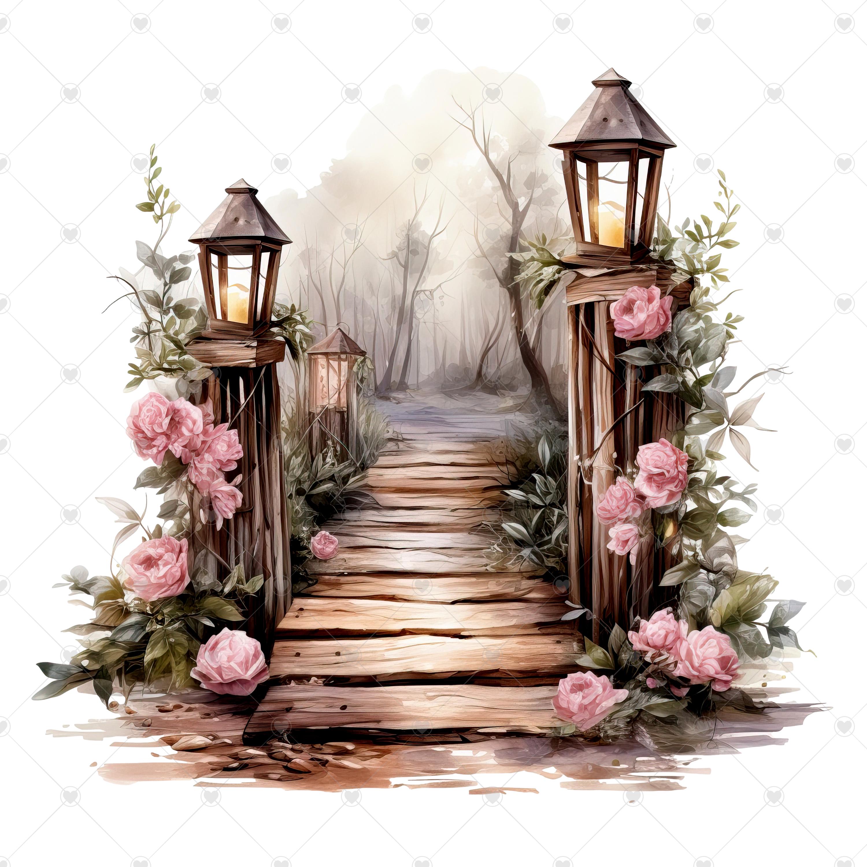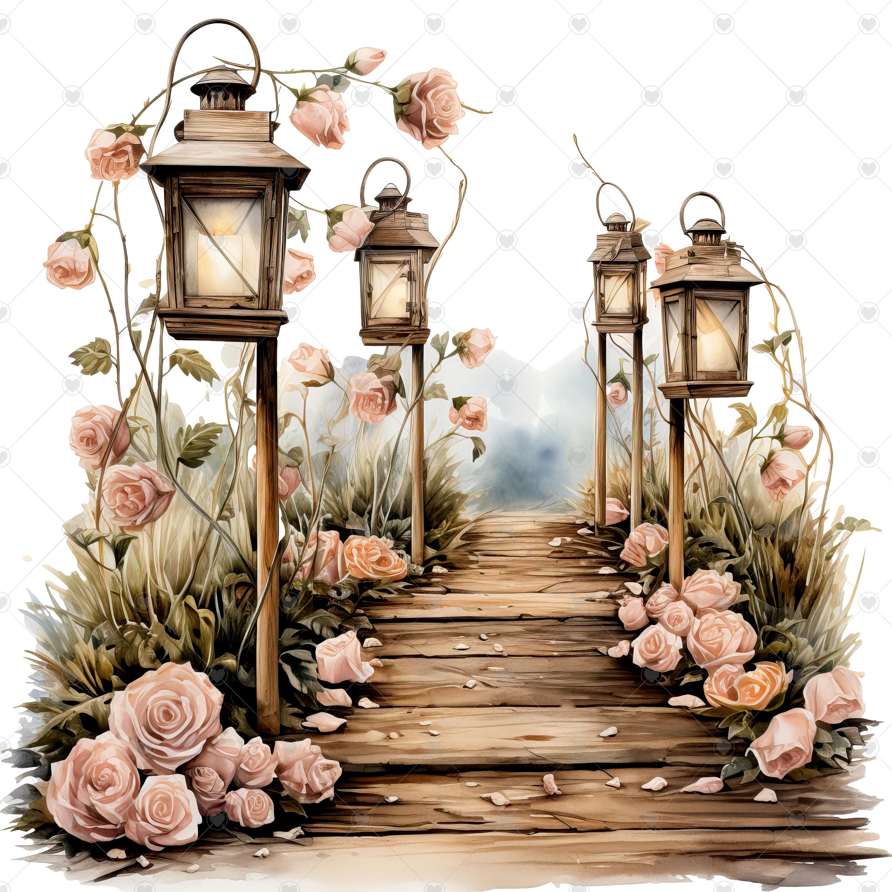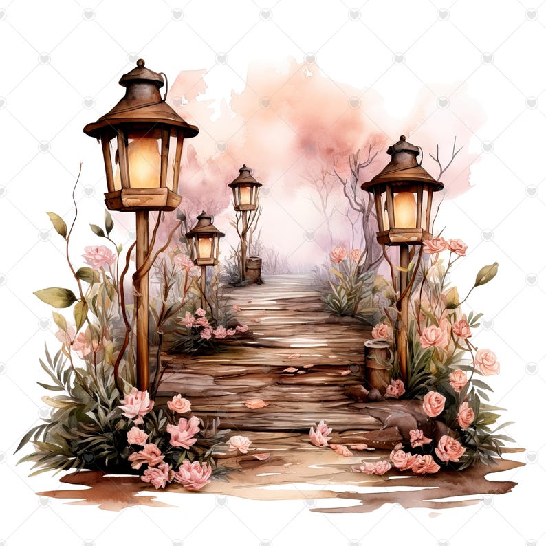 Rustic Pathway With Lanterns and Pink Flowers PNG Clipart Bundle ...