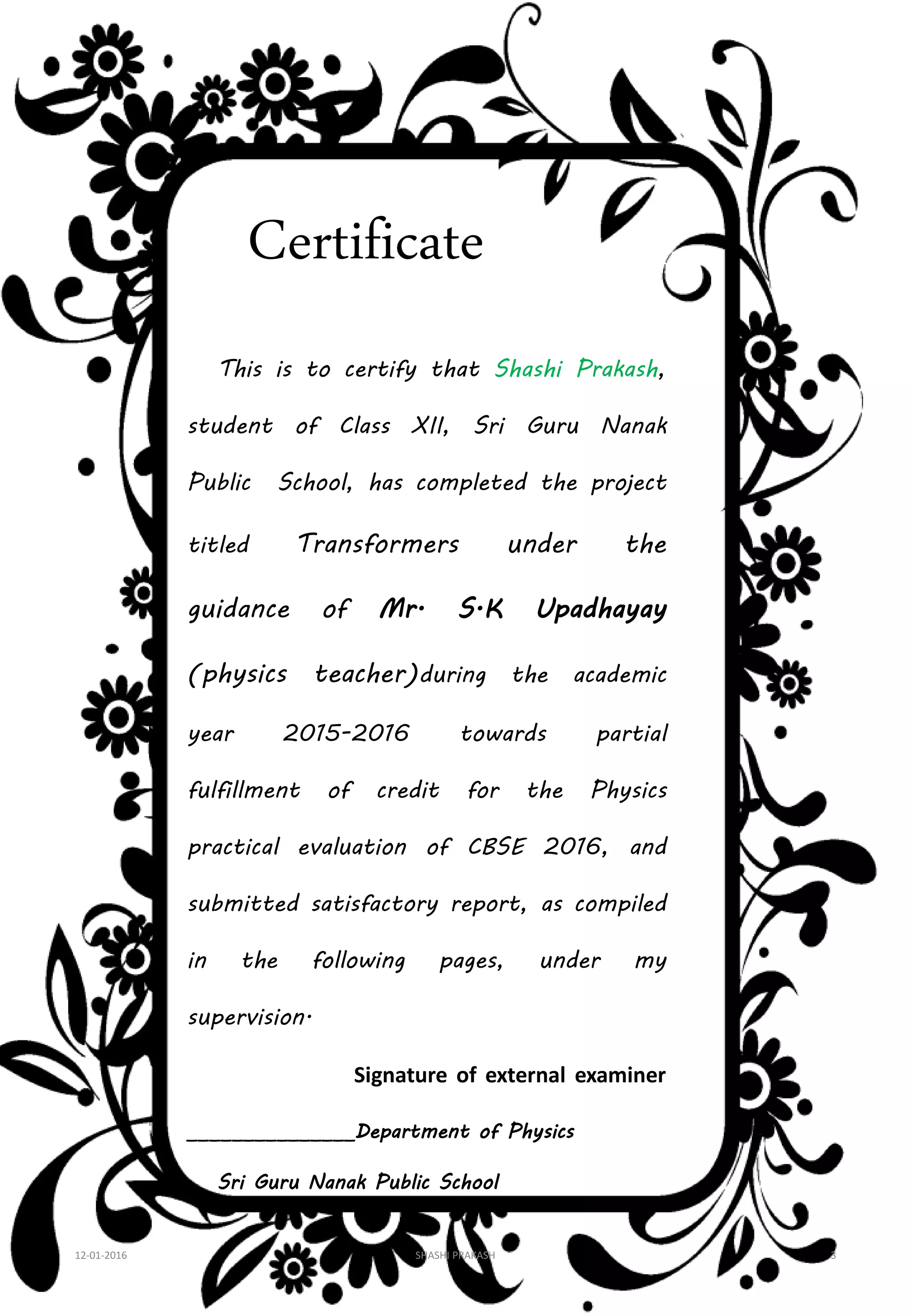Class 12 Physics Project File On Transformer