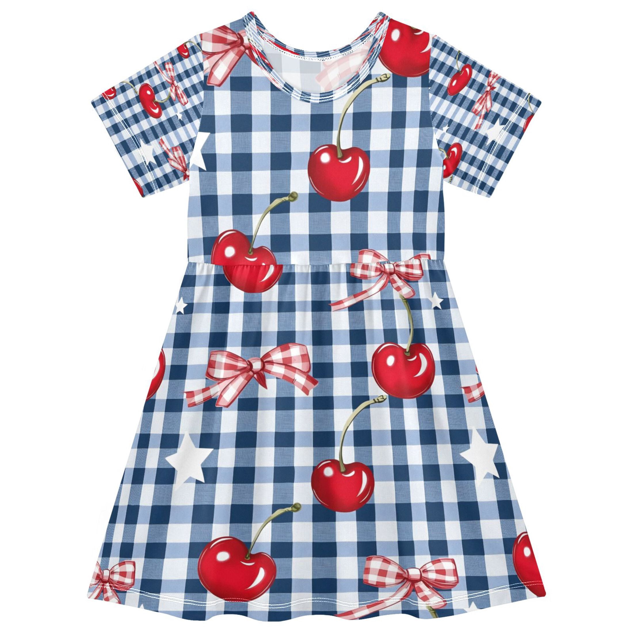 BZSMCE Short Sleeve Dress A-line Silhouette Red Cherries Bows Blue ...