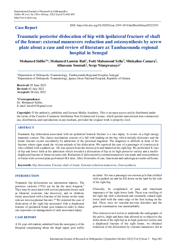 (PDF) Traumatic posterior dislocation of hip with ipsilateral fracture ...