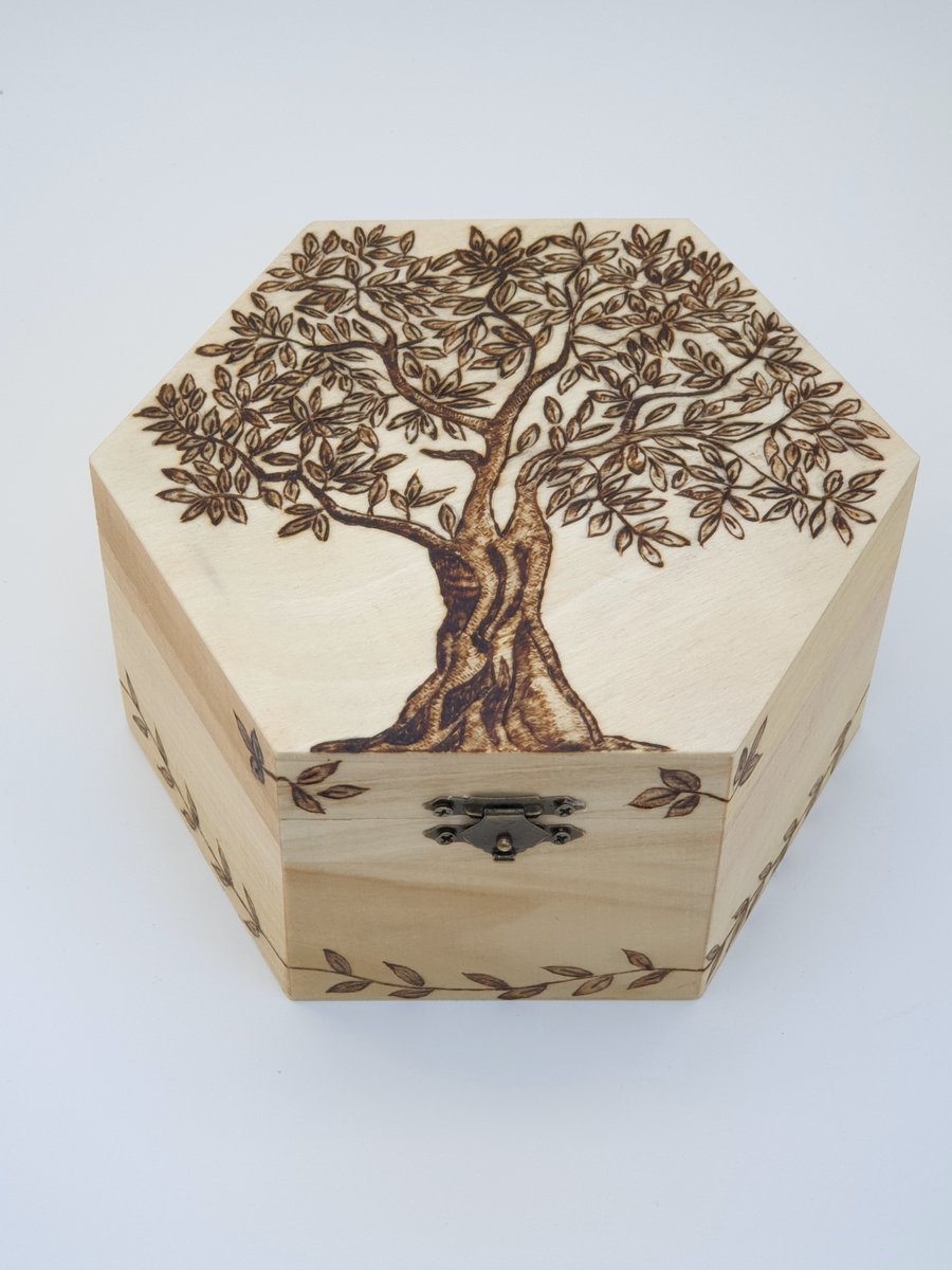 Wooden box with pyrography tree design, decorat... - Folksy