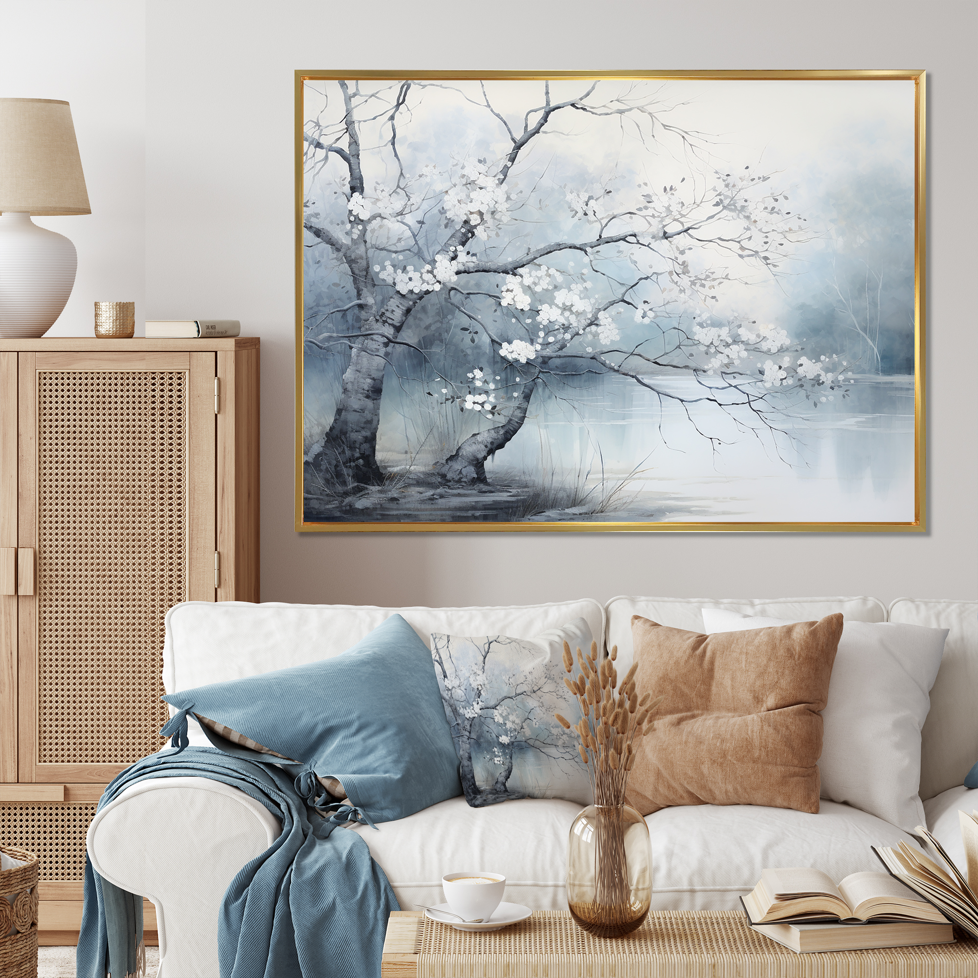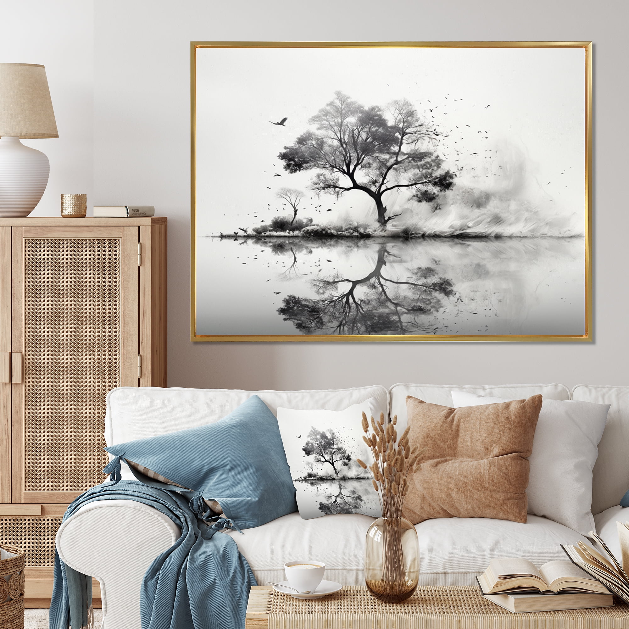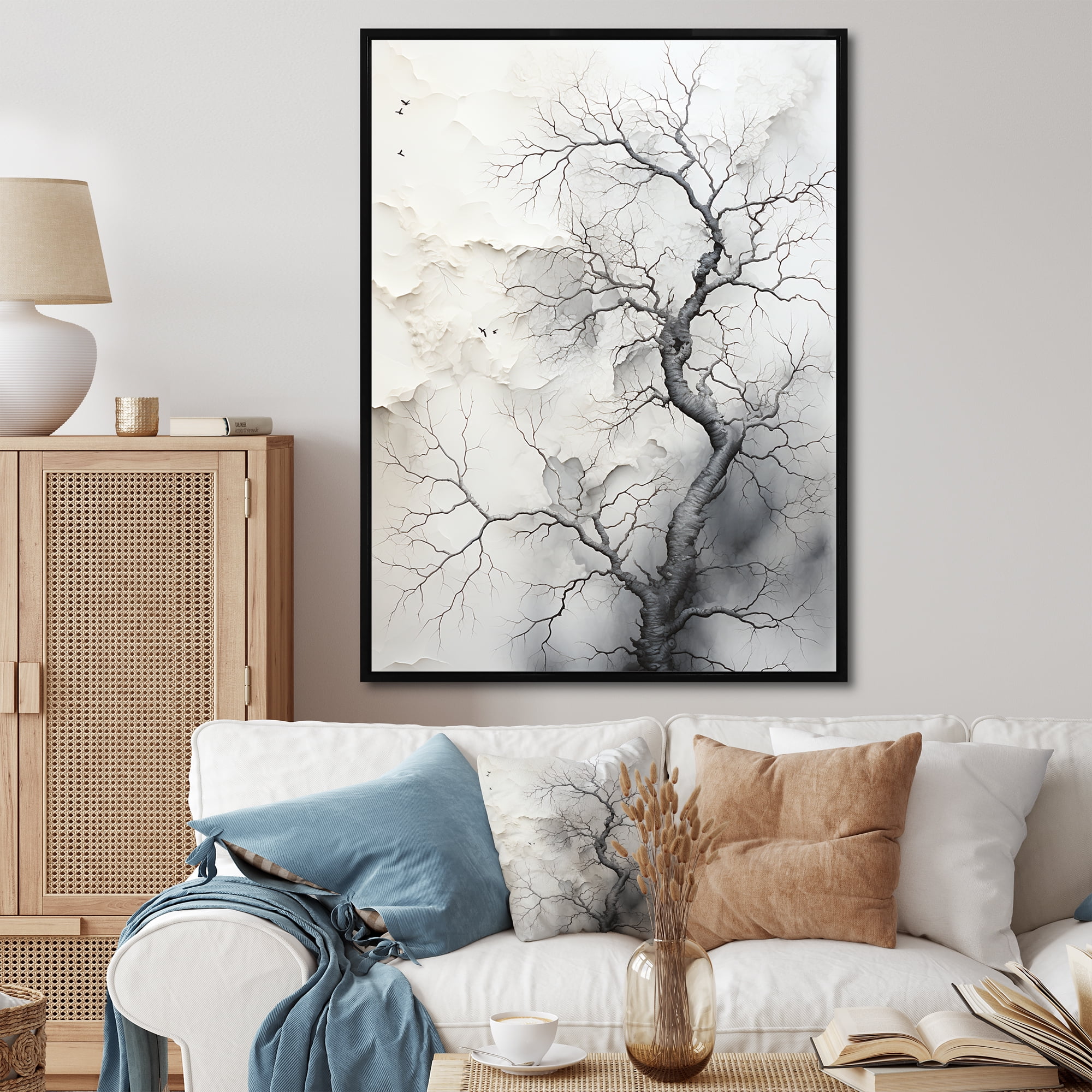 Designart "Reverie Tree White and Grey" Landscape Trees Floater Framed ...
