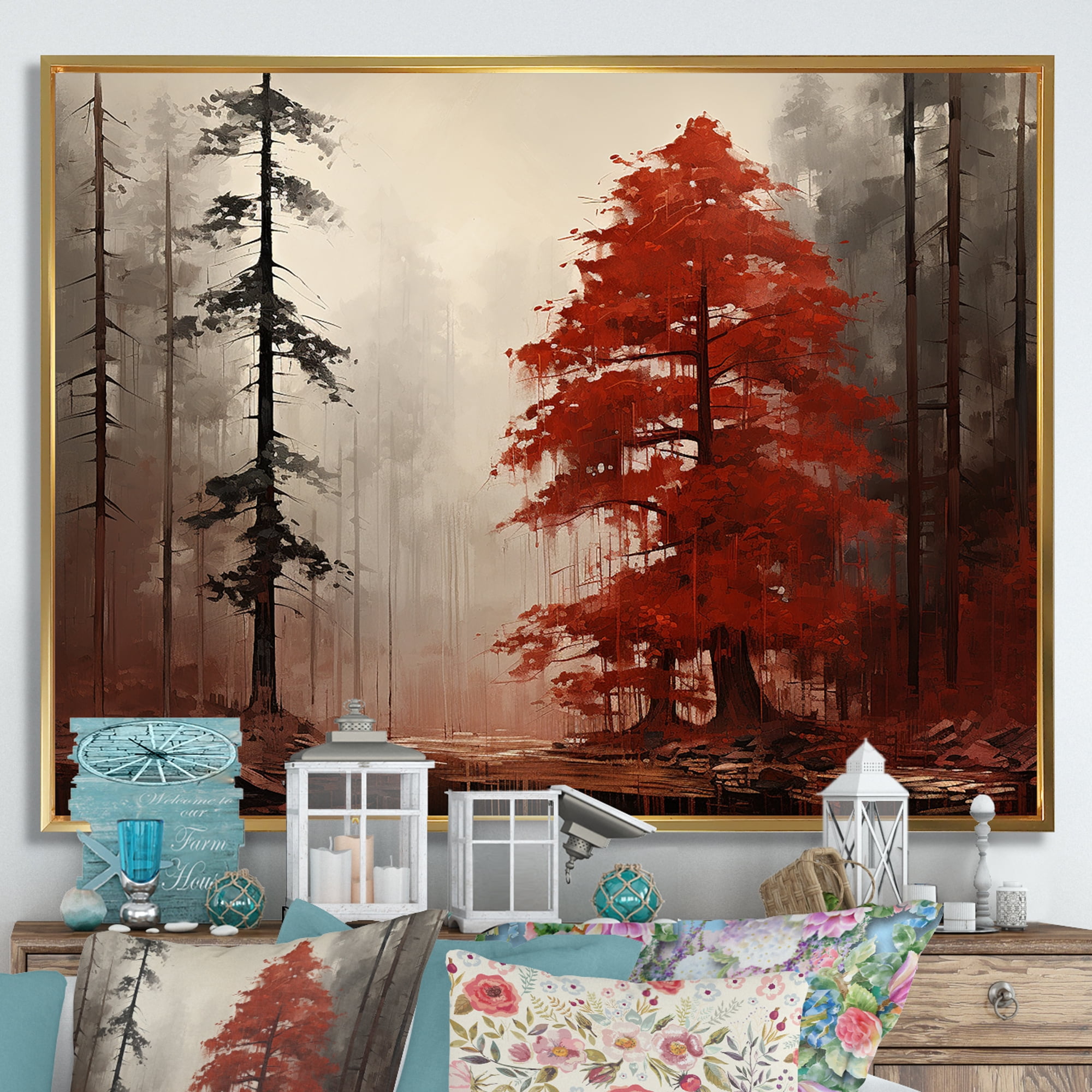 Designart "Monochrome Red And Grey Tree silence III" Landscape Trees ...