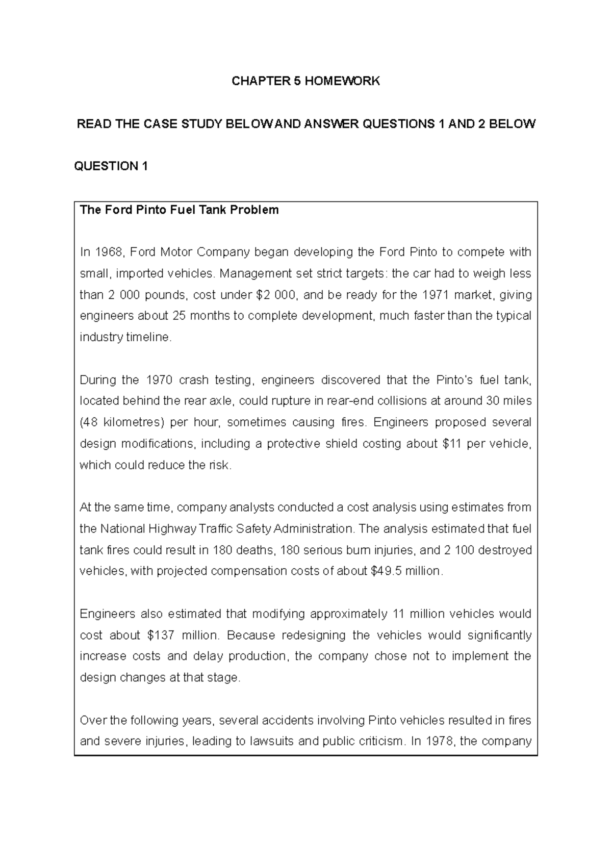 CHAPTER 5 & 6 HOMEWORK: FORD PINTO CASE STUDY ANALYSIS - Studocu