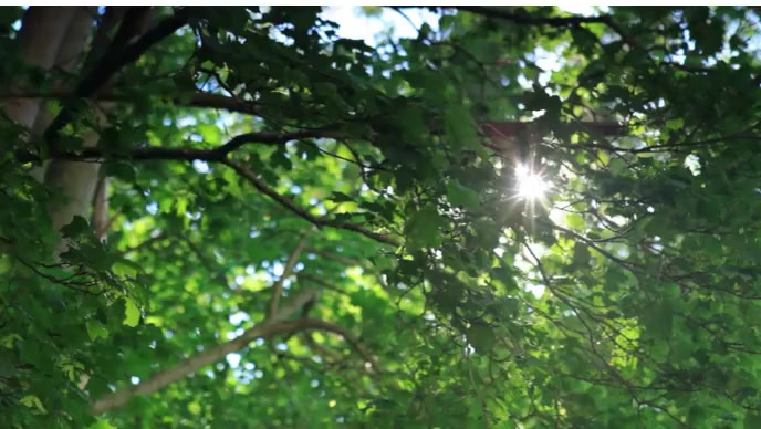 Look up view of lush foliage of trees with afternoon sun. Walking ...