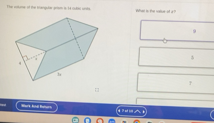 Solved: The volume of the triangular prism is 54 cubic units. What is ...