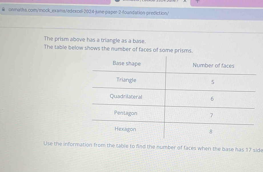Solved: The prism above has a triangle as a base. The table below shows ...
