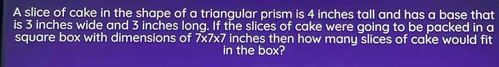 A slice of cake in the shape of a triangular prism is 4 inches tall and ...