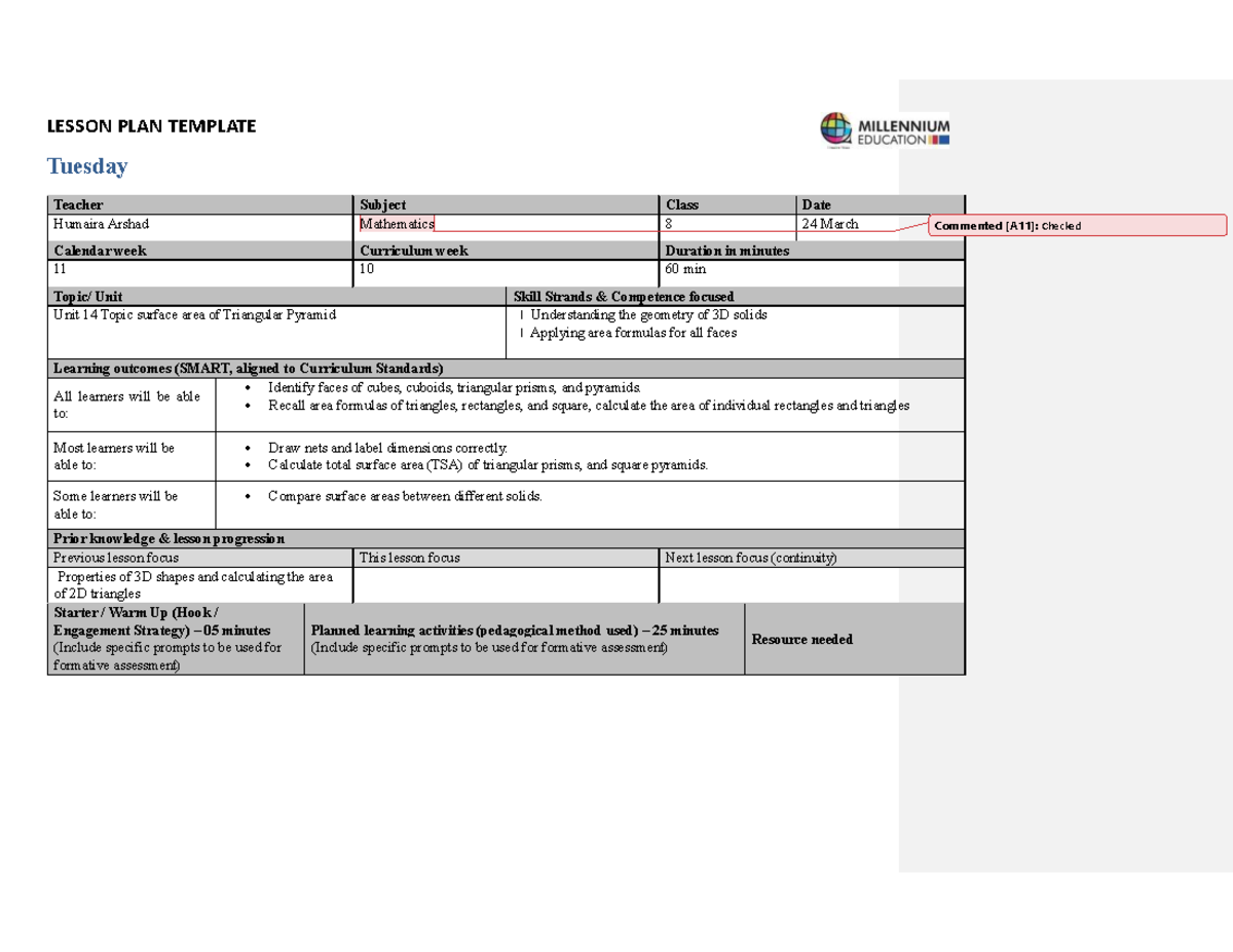Mathematics Lesson Plan: Surface Area of Triangular Pyramid (Class 8 ...