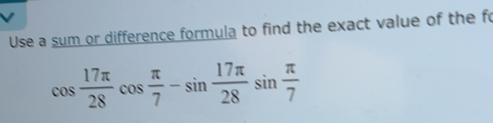 Solved: Use a sum or difference formula to find the exact value of the ...