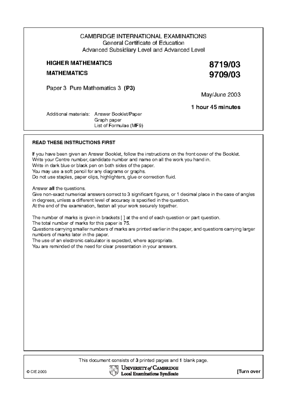 CIE 9709/03 Higher Mathematics Paper 3 Exam 2003 Guide - Studocu