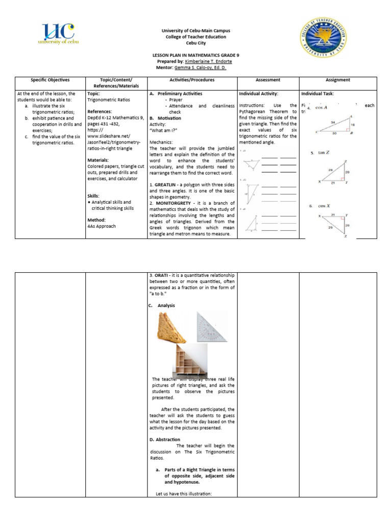 Detailed Lesson Plan in Mathematics (Trigonometry) : I. Objectives ...