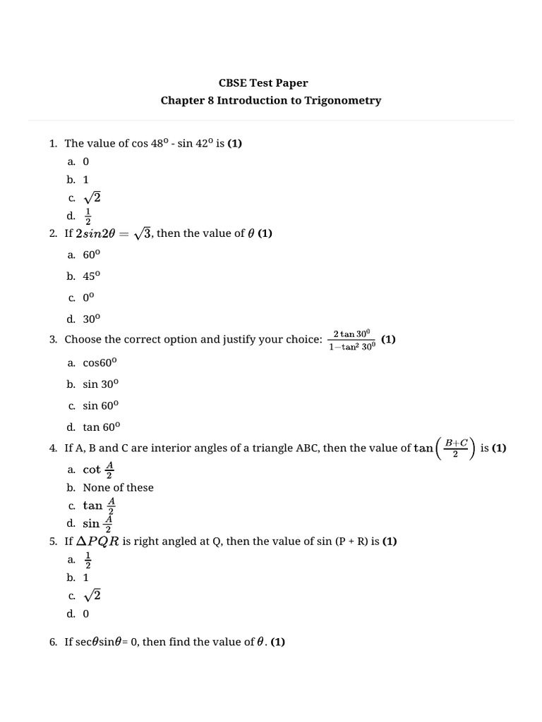 Practice Questions Trigonometry Class X | PDF | Trigonometric Functions ...