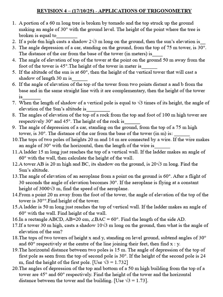 Applications of Trigonometry Practice Questions | PDF | Height | Shadow