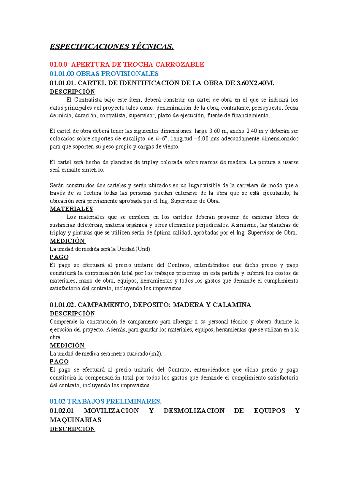 Apertura DE Trocha Carrozable - ESPECIFICACIONES TÉCNICAS. 01.0 ...
