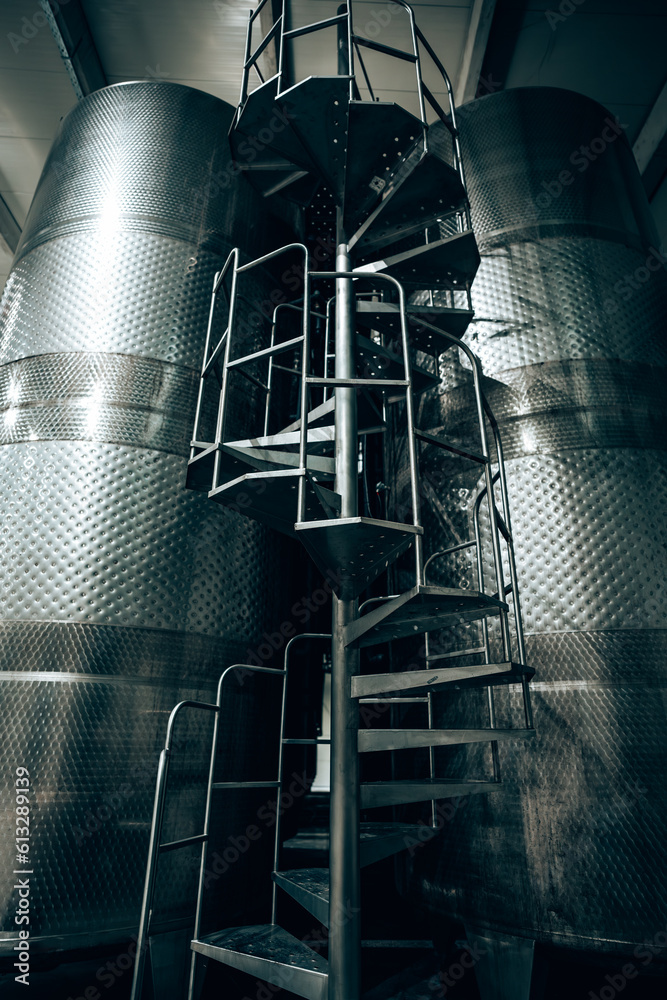 Huge warehouse for wine storing with giant stainless steel tanks ...