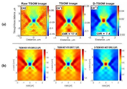 Comparison of (a) the simulation, and (b) the experimental TSOM images ...