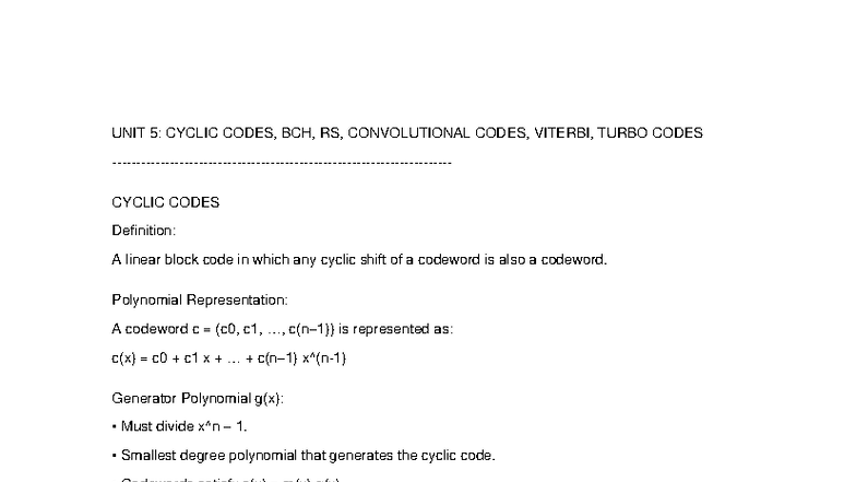 Unit 5: Cyclic Codes, BCH, RS, Convolutional & Turbo Codes Notes - Studocu