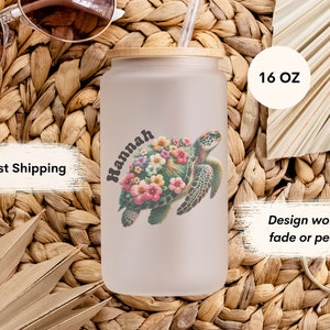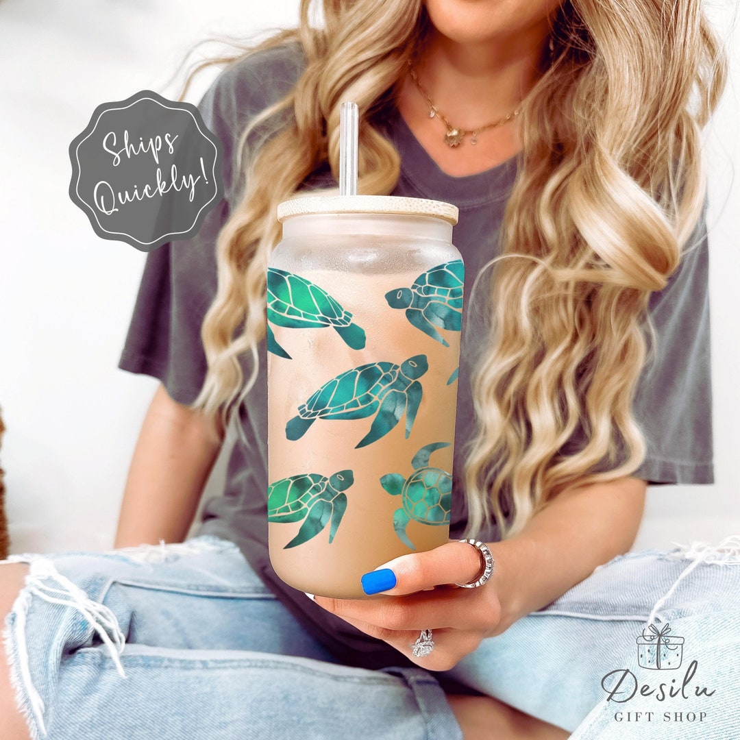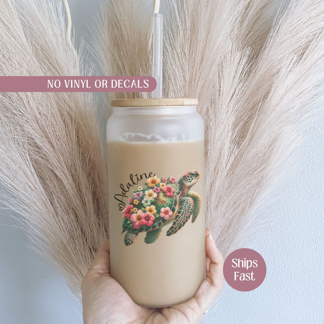 Personalized Turtle Frosted Glass Cup, Sea Turtle Iced Coffee Cup, Sea ...