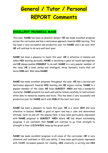 Personal / General / Tutor reports - Bank of comments | Teaching Resources