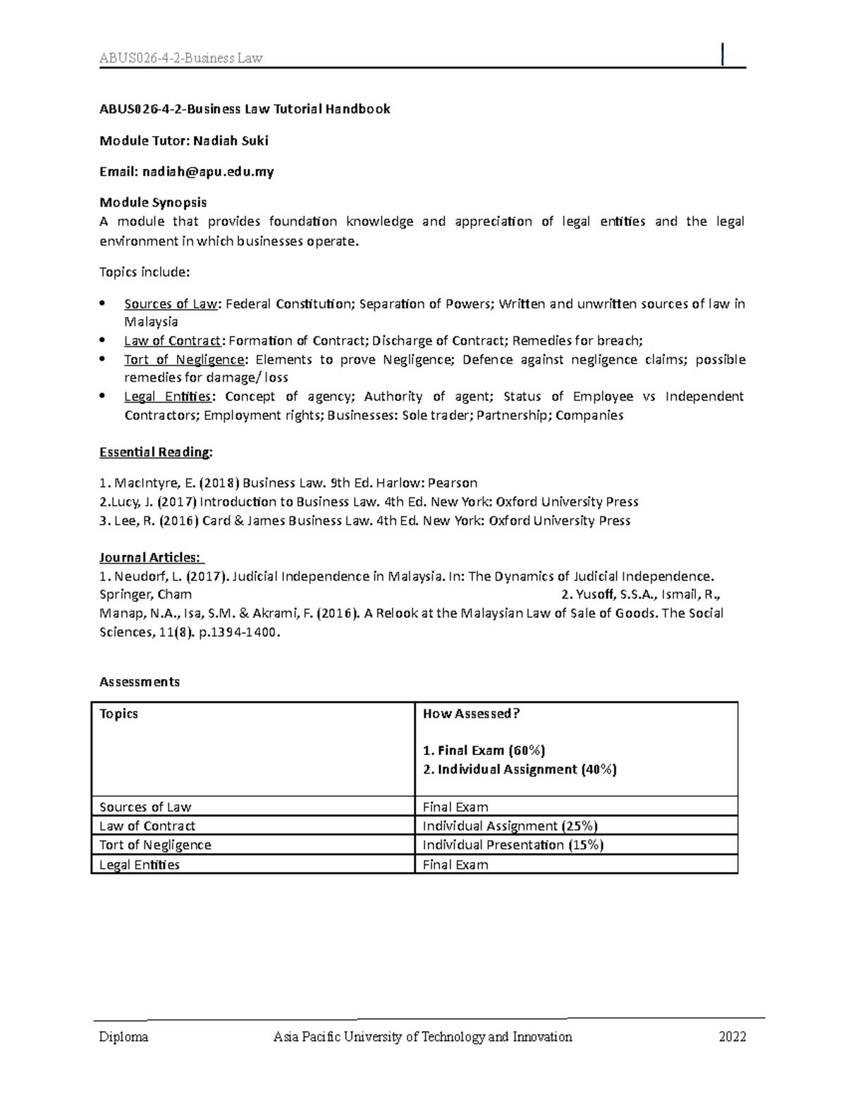 Tutorial Handbook ABUS026-4-2-BLW - ABUS026-4-2-Business Law Tutorial ...