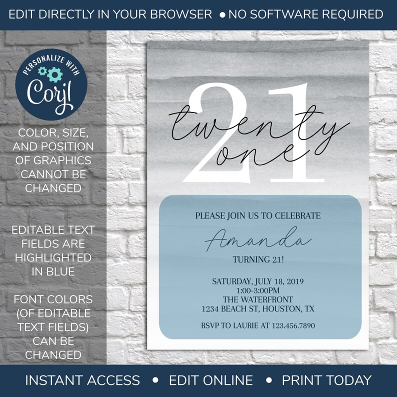 EDITABLE 21st Birthday Invitation Twenty One Invitation - Etsy