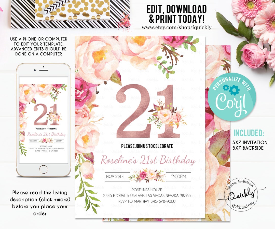 Printable 21st Twenty One Birthday Invitation Editable Rose - Etsy