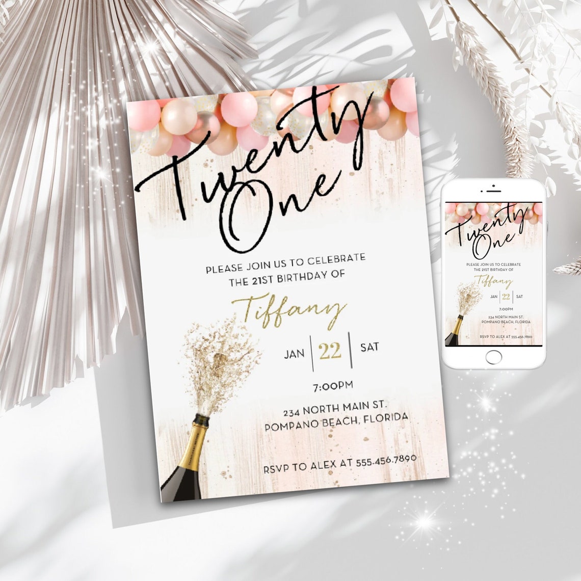 21st Birthday Invitation Editable Template Twenty One Invite Champagne ...