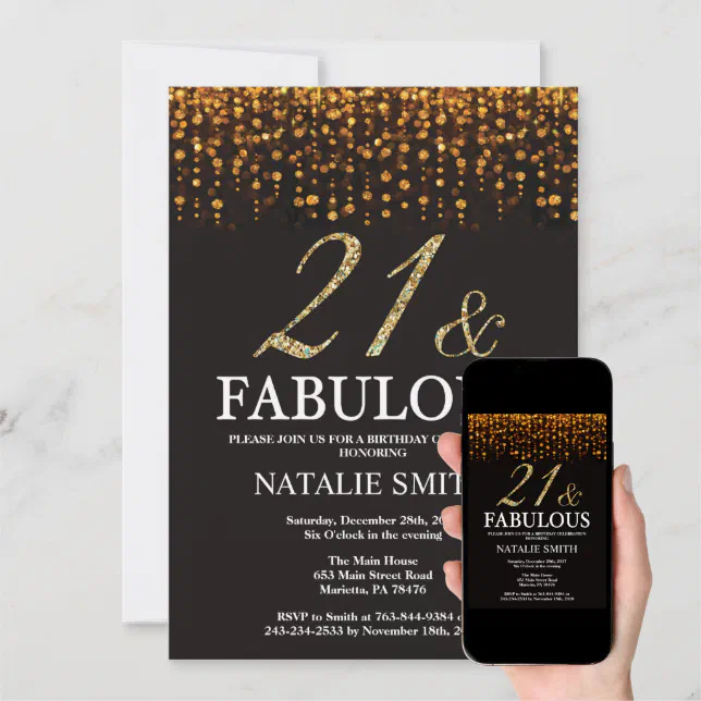 21st Birthday Twenty one and Fabulous Gold Glitter Invitation | Zazzle